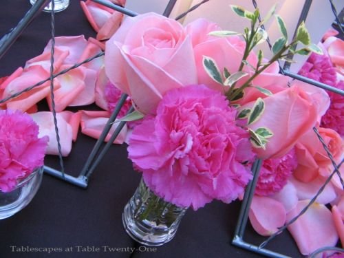 This night was a little warm, and that just brought the sweet smell of these pretty posies to the fore. Wonderful! I chose roses and carnations because they are so pretty together, and the variation in the depth of pink in the roses was interesting. Both were clipped within an inch of their little lives to create the mounding effect at the bottom of the tower and to float in the clear oyster votive cups. Stray rose petals helped to fill out the look.