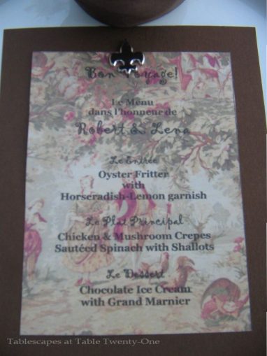 I always knew this “Eiffel Tower” would come in handy for something! As my globetrotting friends set out on yet another wonderful cross-Atlantic adventure, we said goodbye with a dinner featuring tidbits of decor and cuisine they will likely encounter in “gay Paree!”