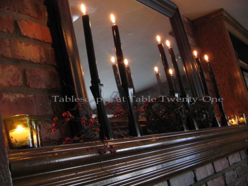 Ramon gets very antsy about all this fire, but I love it! It’s so soothing and everybody looks better by candlelight!!! (After that near disaster in September, I watch candles like a hawk!!!) The tapers set against the mirror double back the look for depth and extra light. The side votives extend the mantel piece and provide an additional level of light. (Varied levels of light is infinitely more interesting to the eye than a static level!)