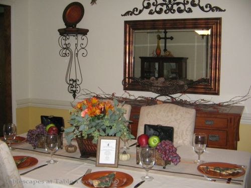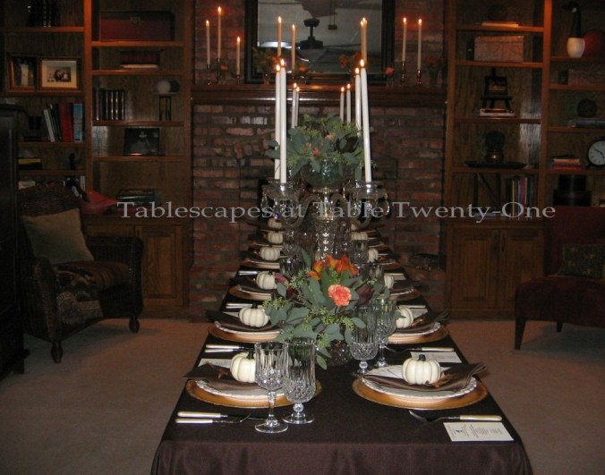 I used rich rust-colored metal chargers, rustic avocado green (does that description date me?) plates and soup bowls, brown cotton napkins and simple faux mother-of-pearl flatware. To keep the tablescape from looking blah, I used a fanciful print cotton table linen with a plain ivory underskirt. The centerpiece floral was loosely constructed, using complementary colors. The ivory centerpiece pillar candles rest atop rustic…dare I say it again…avocado green candlesticks.