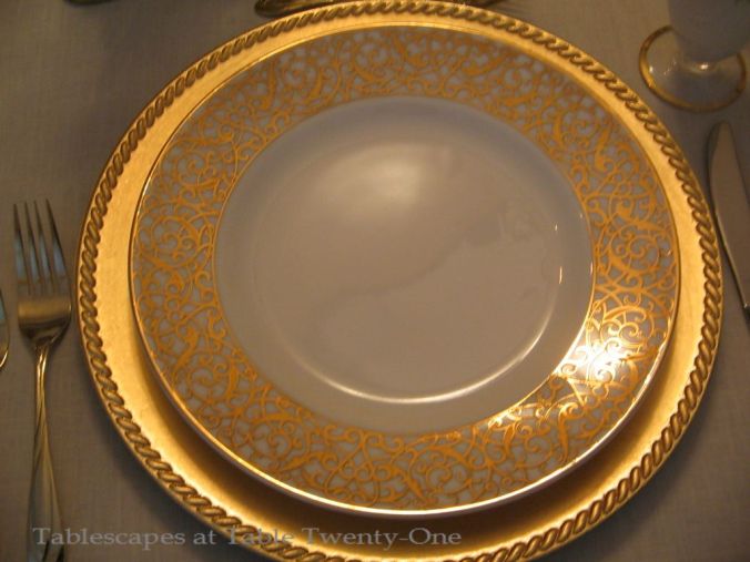 Keeping with the gold and scroll themes, I used goldplated flatware with a swirled design. The magnificent drinking glasses are part of a set my Mother purchased while on a trip to New York back in the 1970s. I always admired the set and am particularly drawn to the Roman soldiers on each. I have never set a table with these until now, but thought no others would do. The intricate gold design just seemed to demand its place on the table!