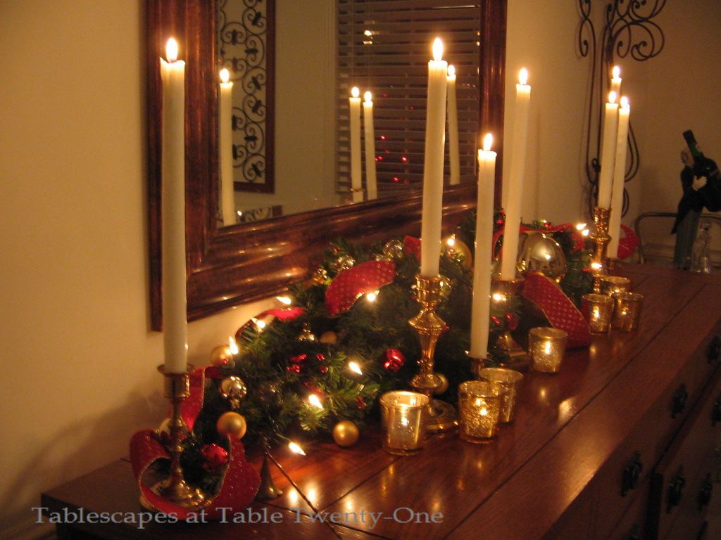 The luncheon table is fun for the young people with all the red & white. The miniature trees decked in red & gold coordinate perfectly with the red & gold-laden lighted greenery on the buffet behind the table. After the luncheon, we adults can enjoy the buffet decor on into the evening with the help of warm multi-level candlelight.