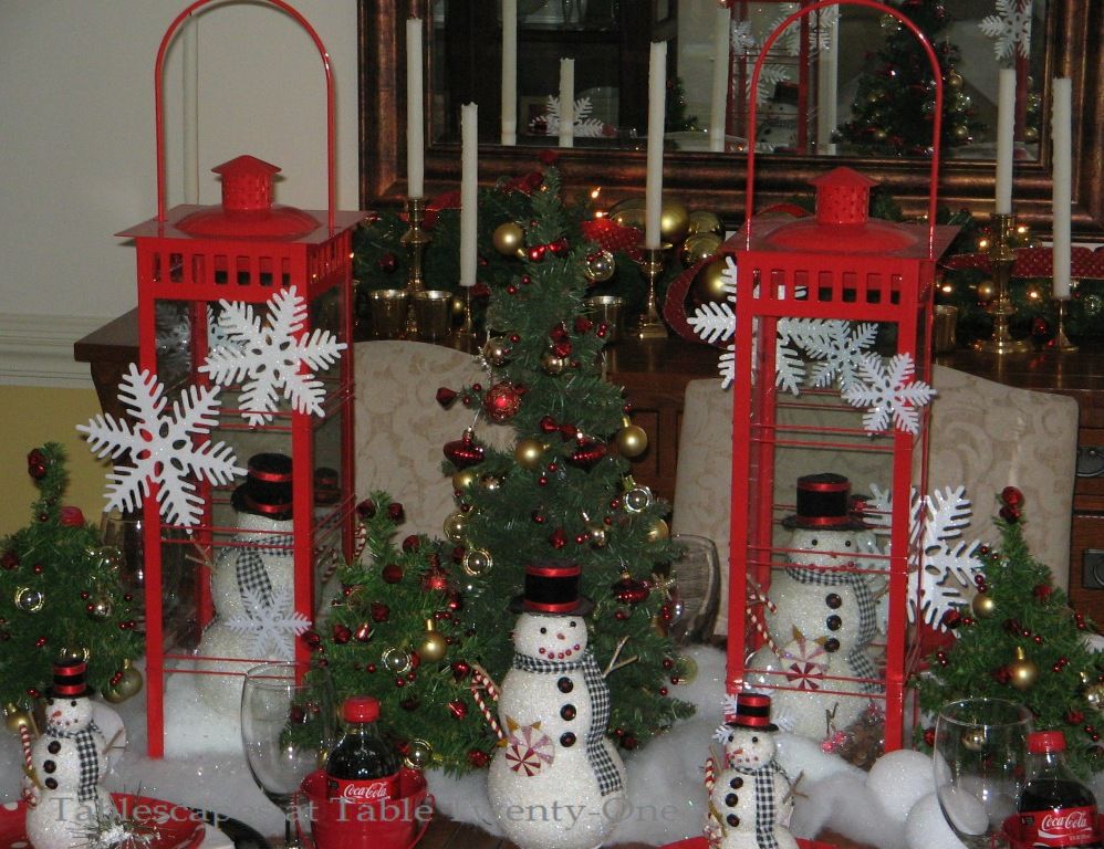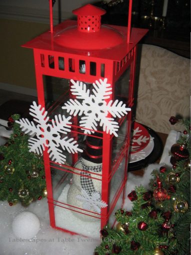 The tablescape is filled with 2 sizes of decorated miniature trees, bright red lanterns from Pier 1 , and more snowmen all on a carpet of cottony “snow.”