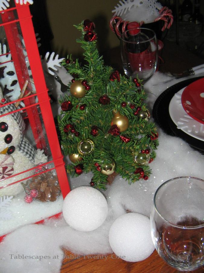 Cheery red, snow-white and chimney black are the predominant colors used for this “tweeners” Christmas luncheon.
