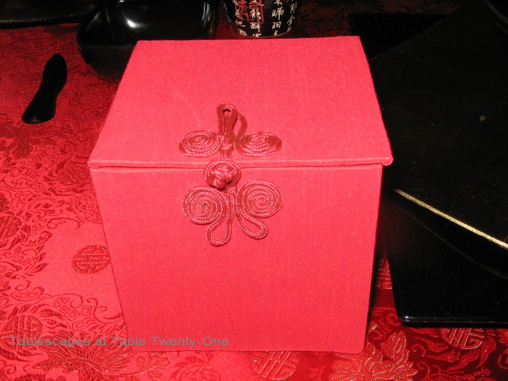 How pretty this is. A wonderful cloth you’ve sewn for your table and I love your arrangement of chopsticks. What a great “red envelope” gift for your guests.