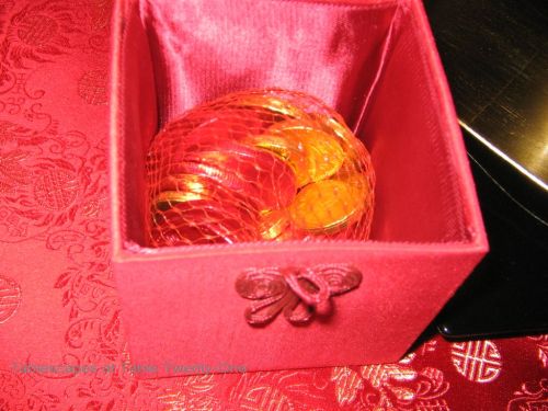 I bought these cool red favor boxes for each place setting at Pier 1 at the end of the 2010 Christmas season. They worked perfectly with this theme! Guests opened the box to find red & gold foil-covered chocolate coins.