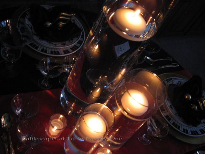 Finally, the centerpiece. I wanted to do something that was easy, inexpensive, and that created an ambience fit for a star. Nothing says “ambience” like candlelight, and by simply floating candles in glass cylinders at different heights and adding a few votives, I think the mission was accomplished.
