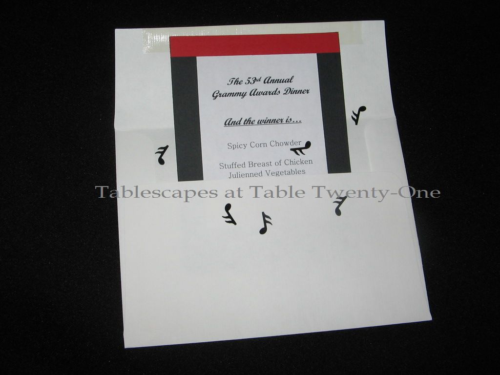 This is another idea I recreated from an at-home event we hosted a few years back. Each guest’s menu was placed in an envelope as if its contents held the name of the winner. Upon opening the envelope to retrieve the menu, the “surprise” was little musical note confetti. I made these menus on our home computer, affixing a red strip of paper across the top of each to again resemble the red carpet.