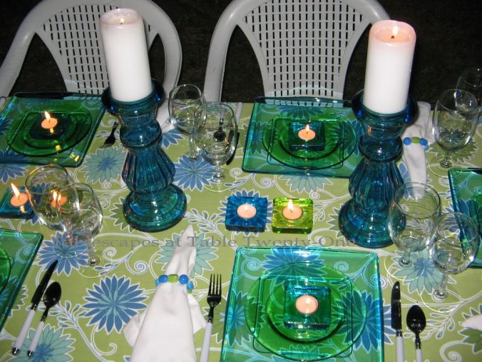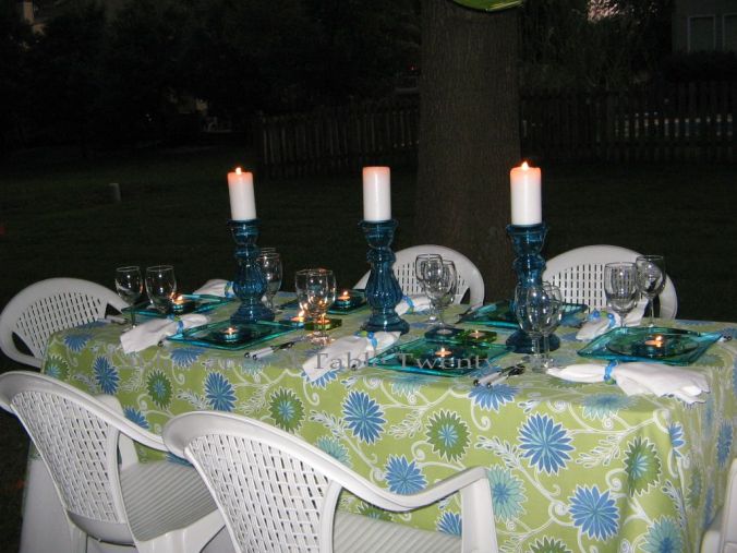 Love the colors.. so cool and refreshing. I agree, simple plates so as not to fight with the pattern.. The lanterns were definitely worth the teeters.. I just got some at World Market at 75% off!!! (and used my 15% coupon too – can you see for pennies??) I love that fabric. It’s just grand that outdoor tables are less wide than dining tables so the fabric works beautifully!