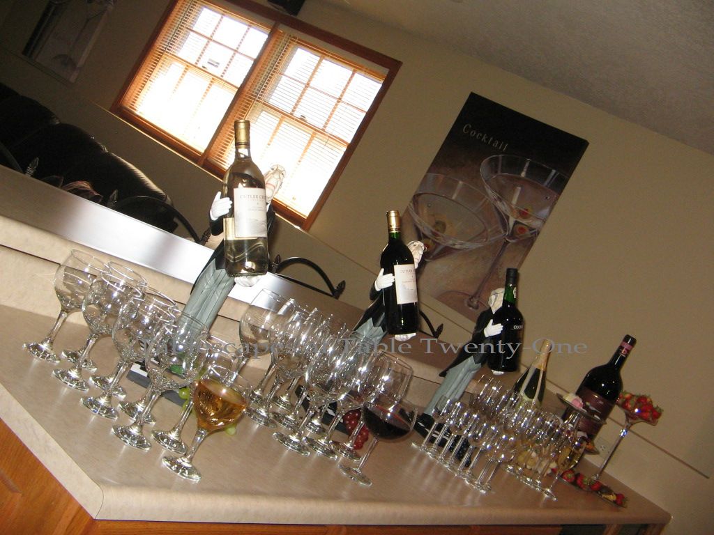 A wine tasting should always include lots of glasses. (Aw, quit your whining…no pun intended. That’s why dishwashers were invented!) Not only does it look really cool to display lots and lots of stemware, but it provides an opportunity for guests to use a different glass to enjoy the full flavor of each wine. Here, the wines are displayed in the recommended order for tasting starting with the light Pinot grigio, moving on to the heavier, more full-bodied Cabernet Sauvignon, and finishing with sweet dessert wines. Appropriately sized and shaped glasses are used for each.