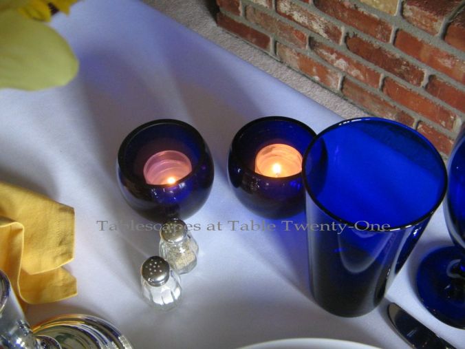 Heavy cobalt blue votive holders bring both color and light to the table’s surface.