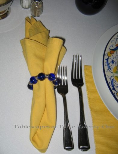 Bright yellow cotton napkins from Bed Bath & Beyond are cinched at the waist with bold cobalt blue napkin rings (Tuesday Morning) that look very much like jewelry. The flatware is Hampton Silversmith’s “Patriot” in the mirrored finish.