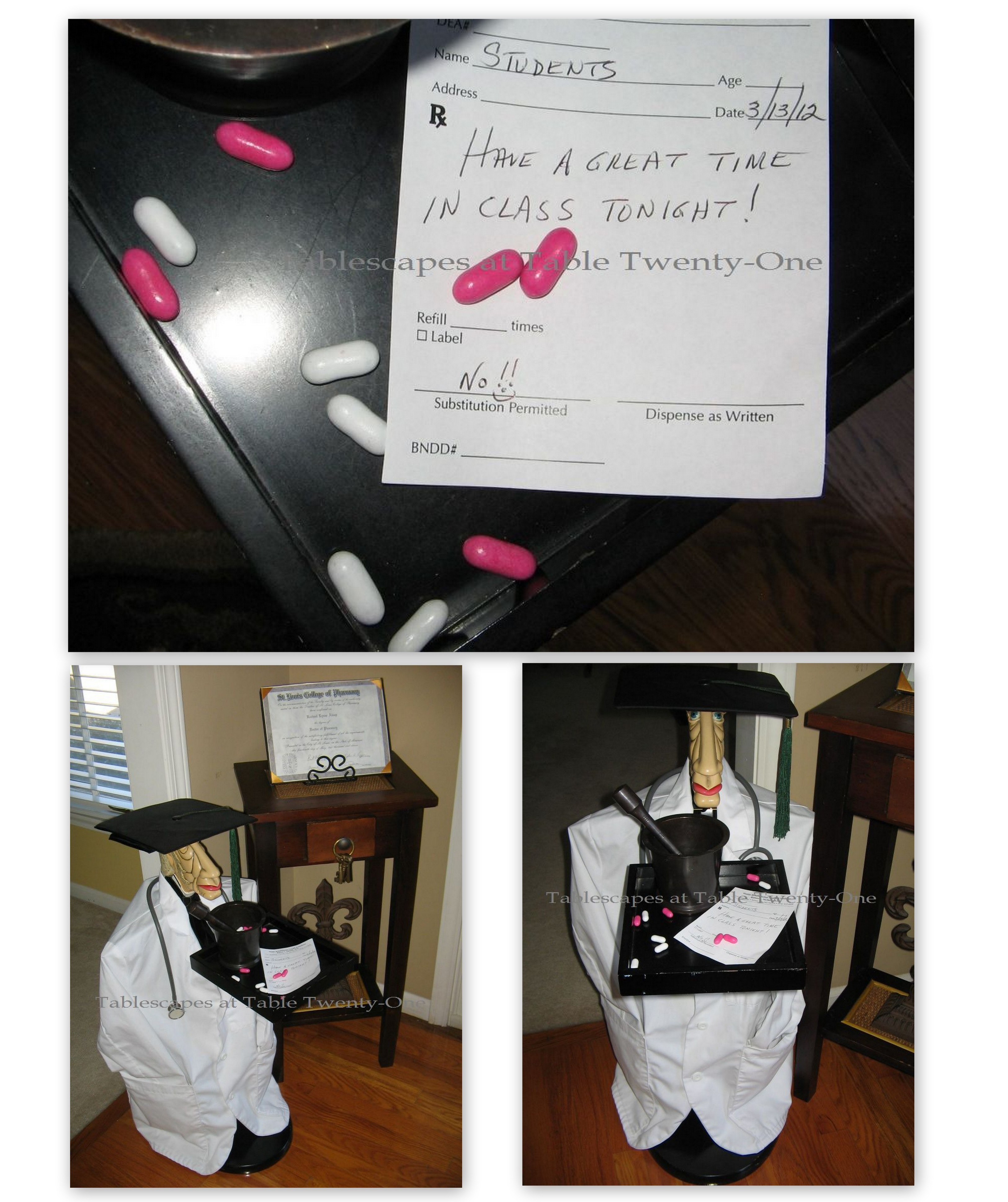 Celebrating a graduation is a fun and happy occasion, so deep-six a bit of the pomp and use something near the front door or in the food area that adds a little whimsy. Here, our faithful butler, Geoffrey, is all decked out in his freshly starched lab coat and mortar board as he celebrates a pharmacy school graduation. (This idea actually came from our next-door-neighbors last Spring when their daughter graduated from St. Louis College of Pharmacy. I asked if they minded if I recreated the look that greeted guests who came to their home to celebrate.) On this evening, the only Rx for my students was to have a great time in class!