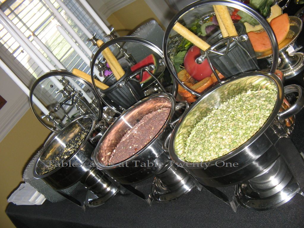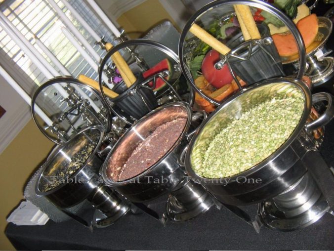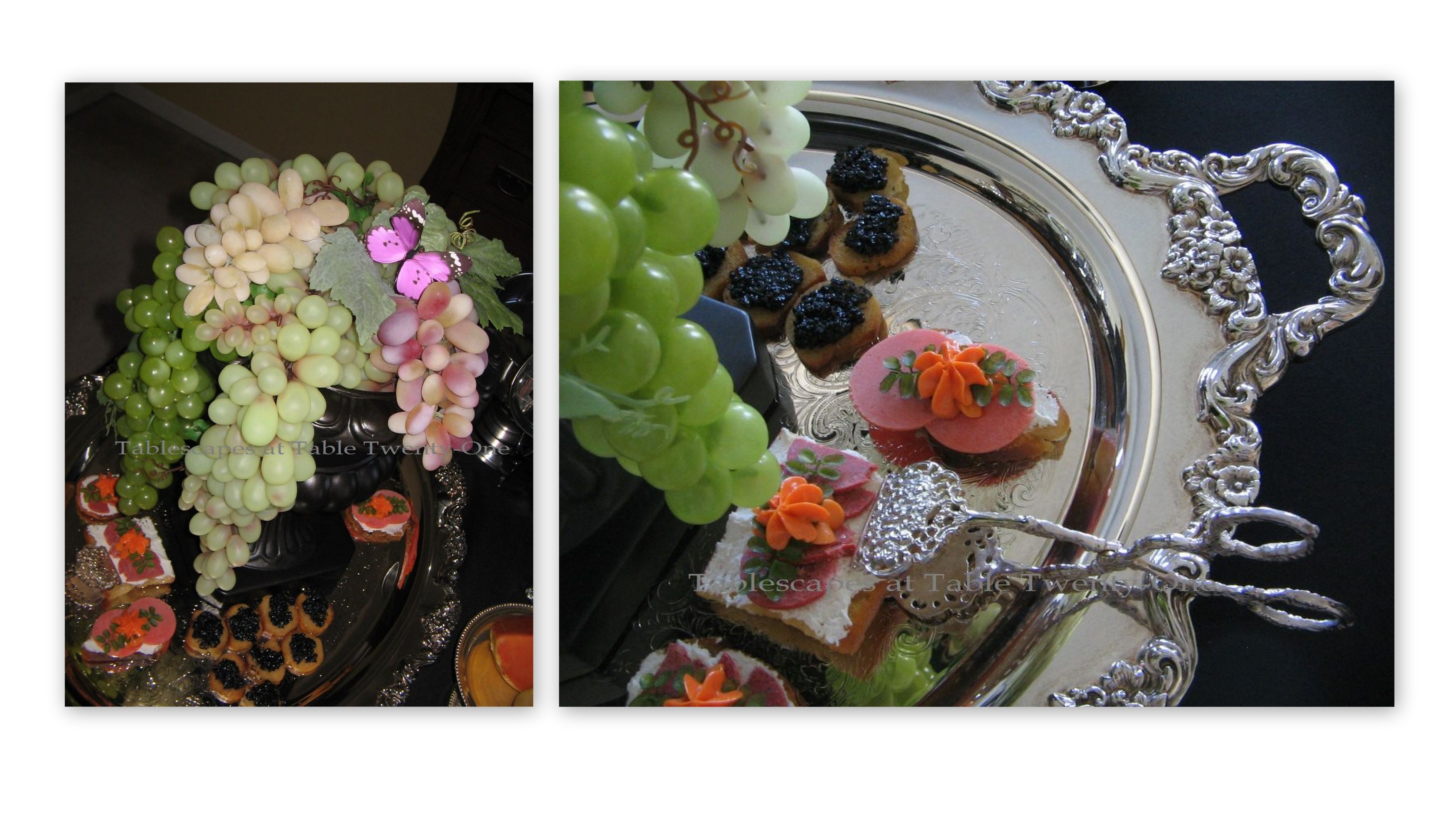Grapes are piled high in an oil-rubbed bronze urn centered on a huge oval tray. A variety of hors d’oeuvres are placed on the tray beneath it. This is one little trick that can make your buffet look a bit more sumptuous AND be used as a space-saving idea as it places food both high and low.