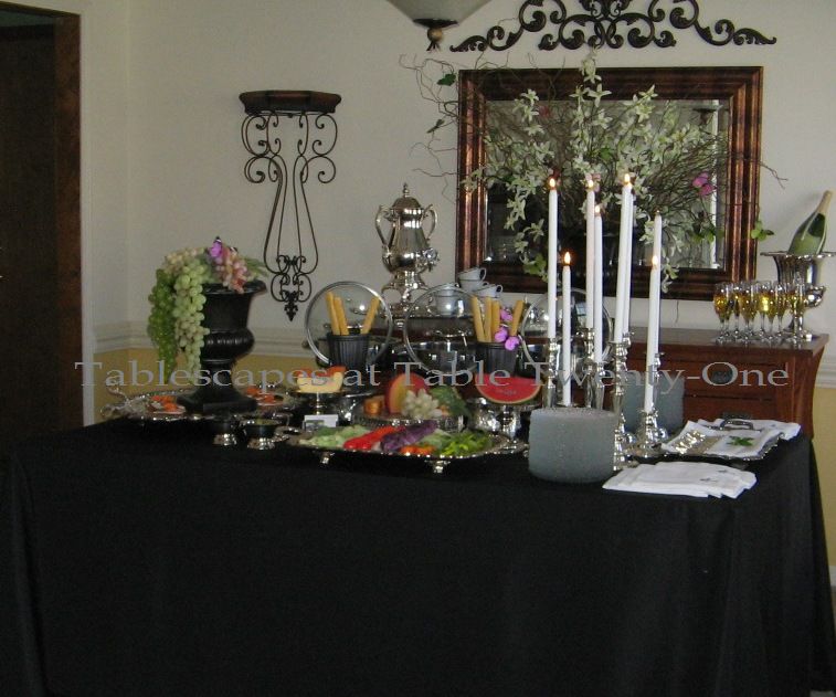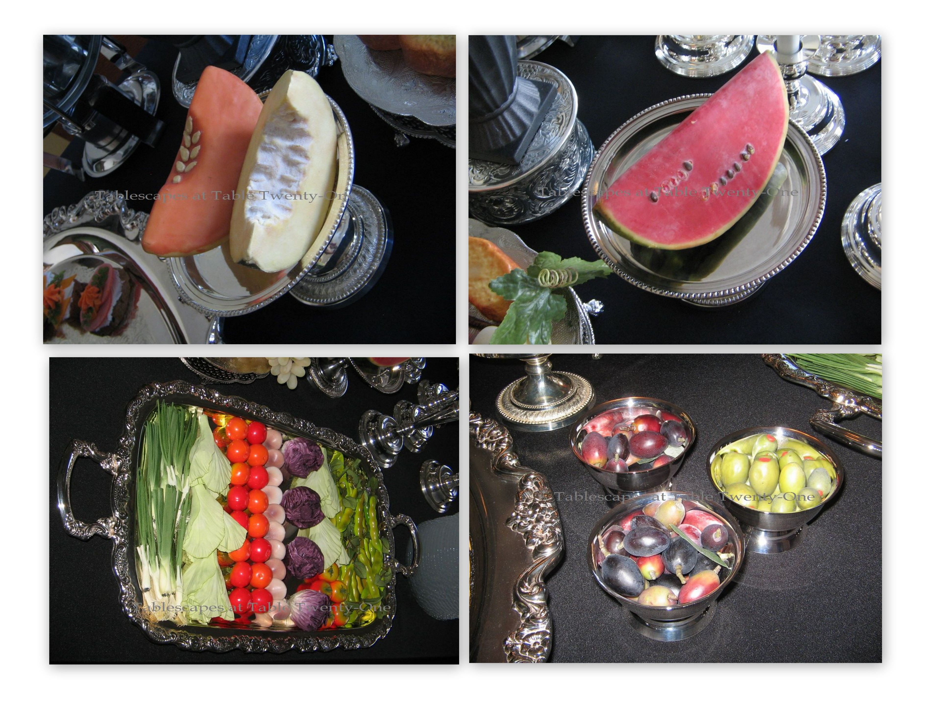 Try using “edible space fillers” like the melon wedges on silver beaded-edge plateaus shown here. This adds color, texture and sometimes fragrance (as in that of cut fruit) to the table while filling in those bare spots. I like for a buffet table to be teeming with food and have that Louis XIV Court at Versailles look about it!