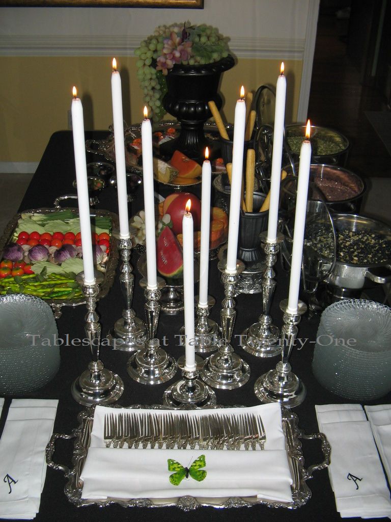 The head of the buffet table has forks nestled side-by-side in a cotton napkin and placed on a silver tray. The butterflies – seen throughout the room – bring spots of color and speak to the Spring season. The initialed napkins, which remind me of the traditional “hood” worn over the gown, are simply stairstepped on either side in front of the Arcoroc “Seabreeze” glass plates. The napkins can be purchased with any letter from A-Z at Bed Bath & Beyond. Separating the eating utensils from the food is a barrage of silver candlesticks arranged at different heights. Peering down the length of a buffet table through candlelight can be quite the dramatic look!