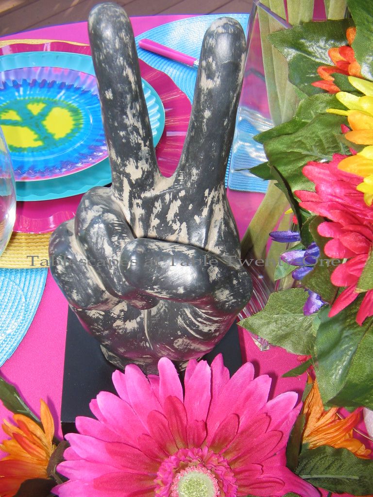 I cannot believe you found those great peace sign plates….This table setting is wonderful…it would make a great setting for a birthday party of a child from the 60’s….I so love it!!!….Your table belongs in the fields of Woodstock!