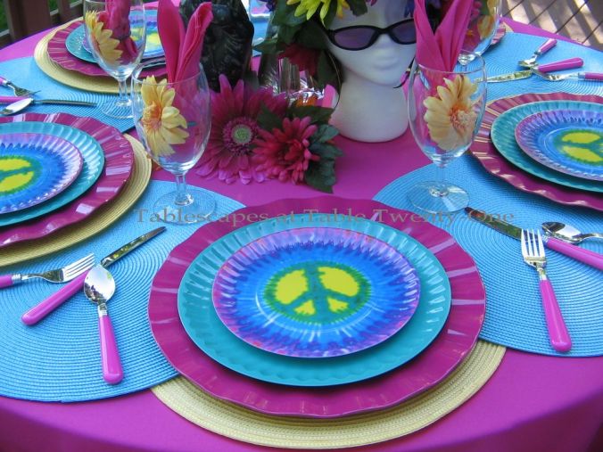 I drew on all the bright, mind-bending colors of the 1960s including hot pink, yellow, and a range of blues. Each psychedelic place setting starts with a yellow woven placemat, slightly overlapped with an aqua one, both from Bed Bath & Beyond. Hot pink ruffled chargers from Crate & Barrel are then topped with an aqua blue plastic dinner plate and a funky fun tie-dye “peace” salad plate from Hobby Lobby.(Have your corneas burned out yet? :-))