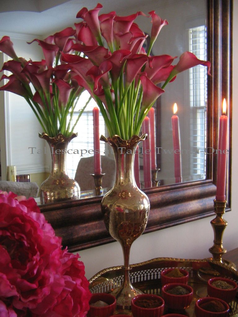 I carried the hot pink color to the buffet via a small arrangement of peonies and a more imposing bouquet of calla lilies in a brass vase from India.