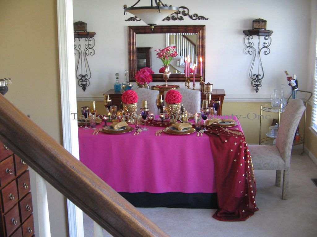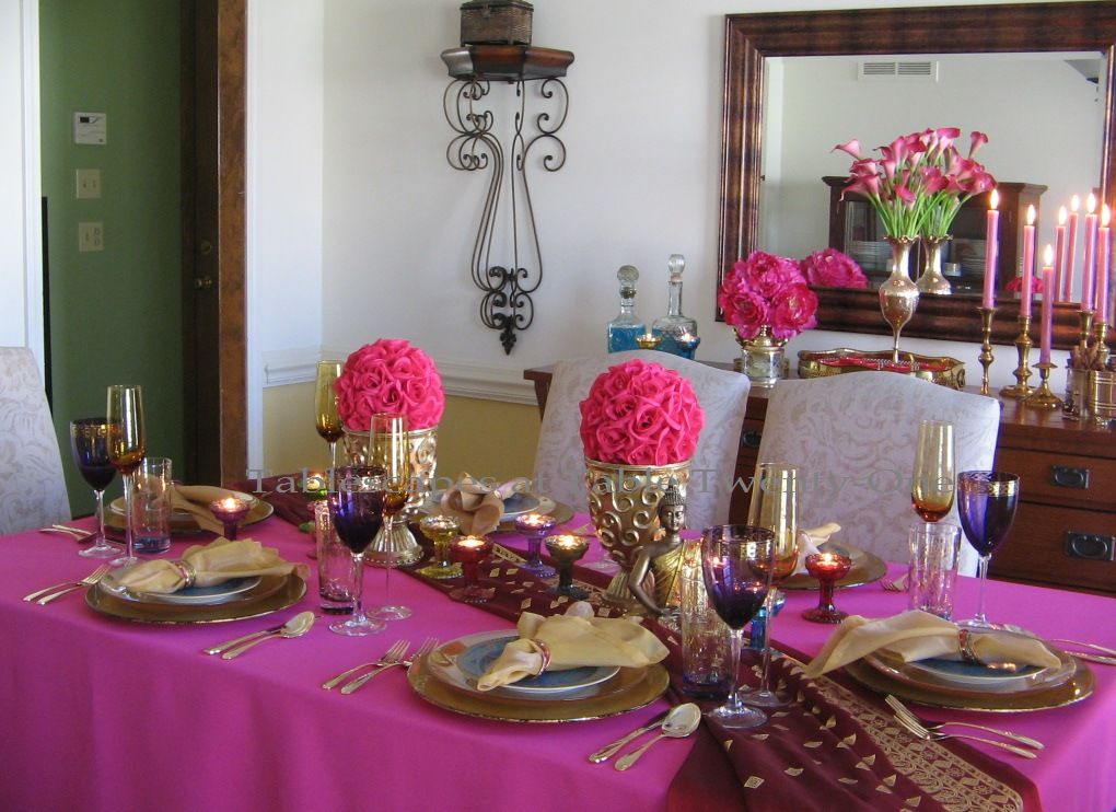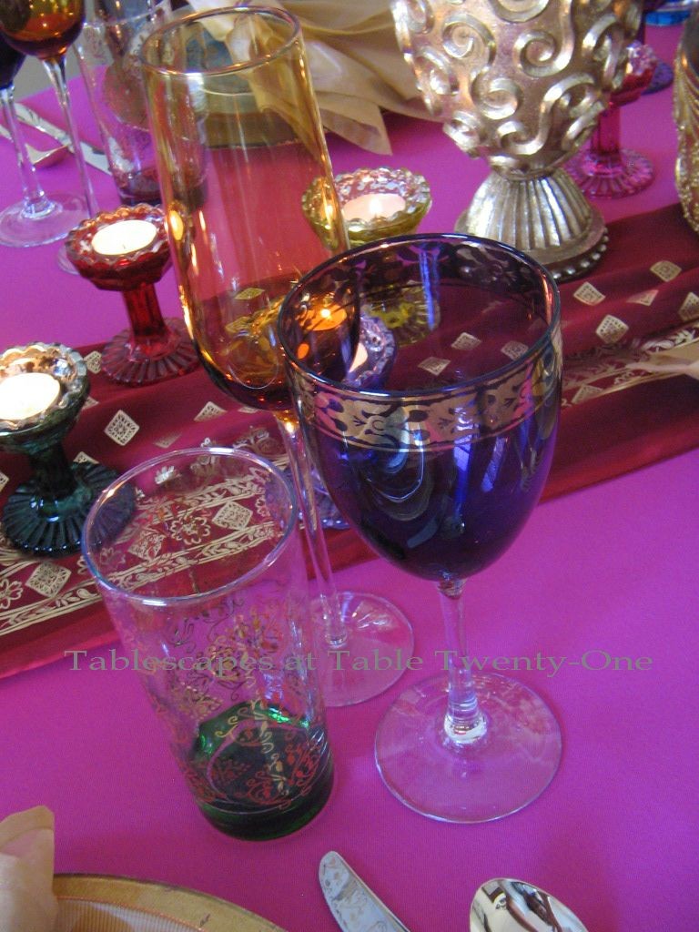 20. Beautiful table, I think you nailed the Indian culture with your bright colors, the pink tablecloth is a big punch of color. Love the china and stemware, lots of touches that all say Indian to me.