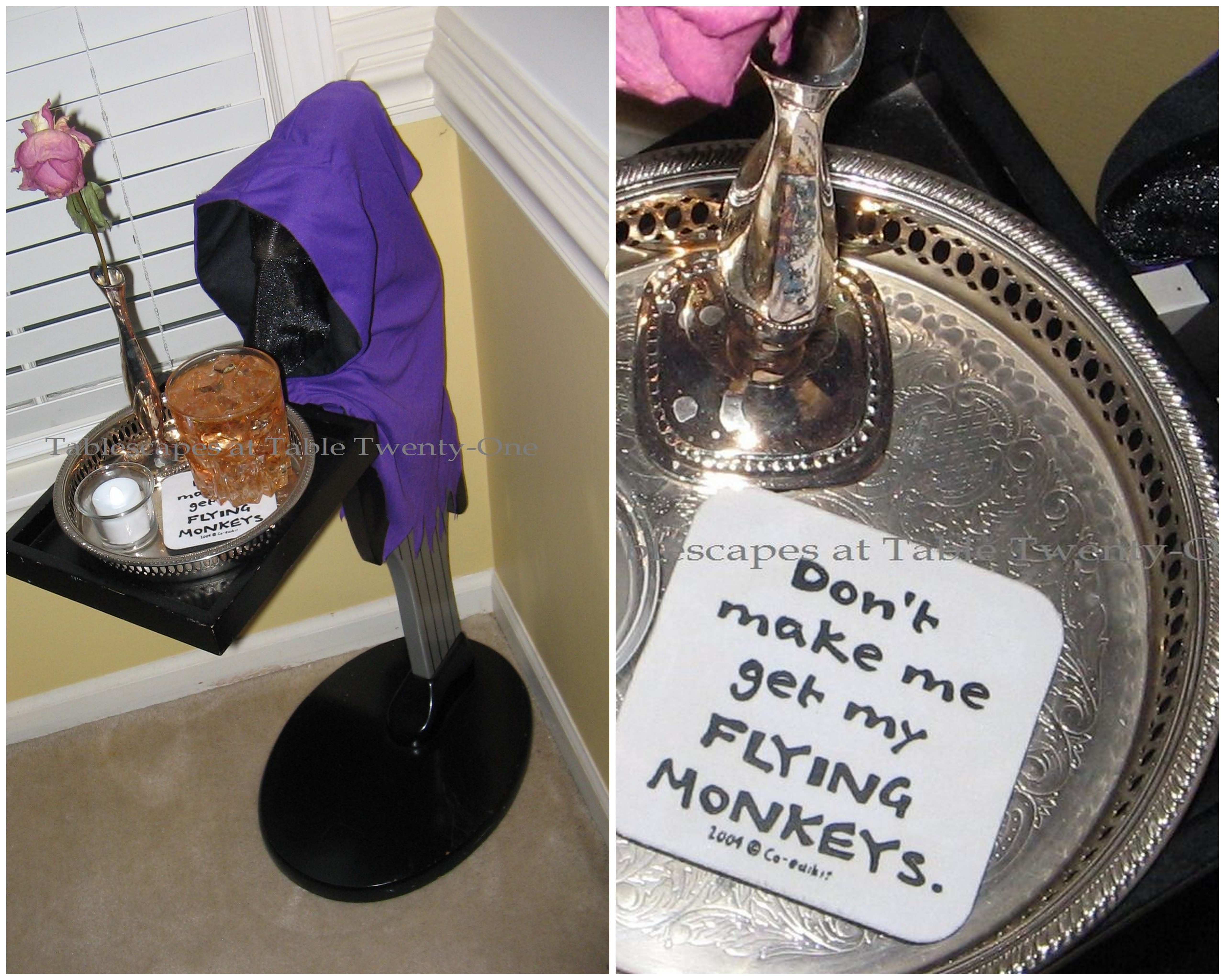 I used plain clear glass stemware from Old Time Pottery. The flatware is Hampton Silversmiths “San Remo” stainless which in this context takes on a sort of Gothic look. The black & white floral napkins (Stein Mart) adopt a decidedly spookier look when rolled and secured with the spiked napkin ring. The Dollar Tree napkin rings are actually those popular slap on bracelets. These would be really fun as a dual purpose napkin ring/favor for guests! Tip: Stretch your dollars by incorporating favors into the decor!