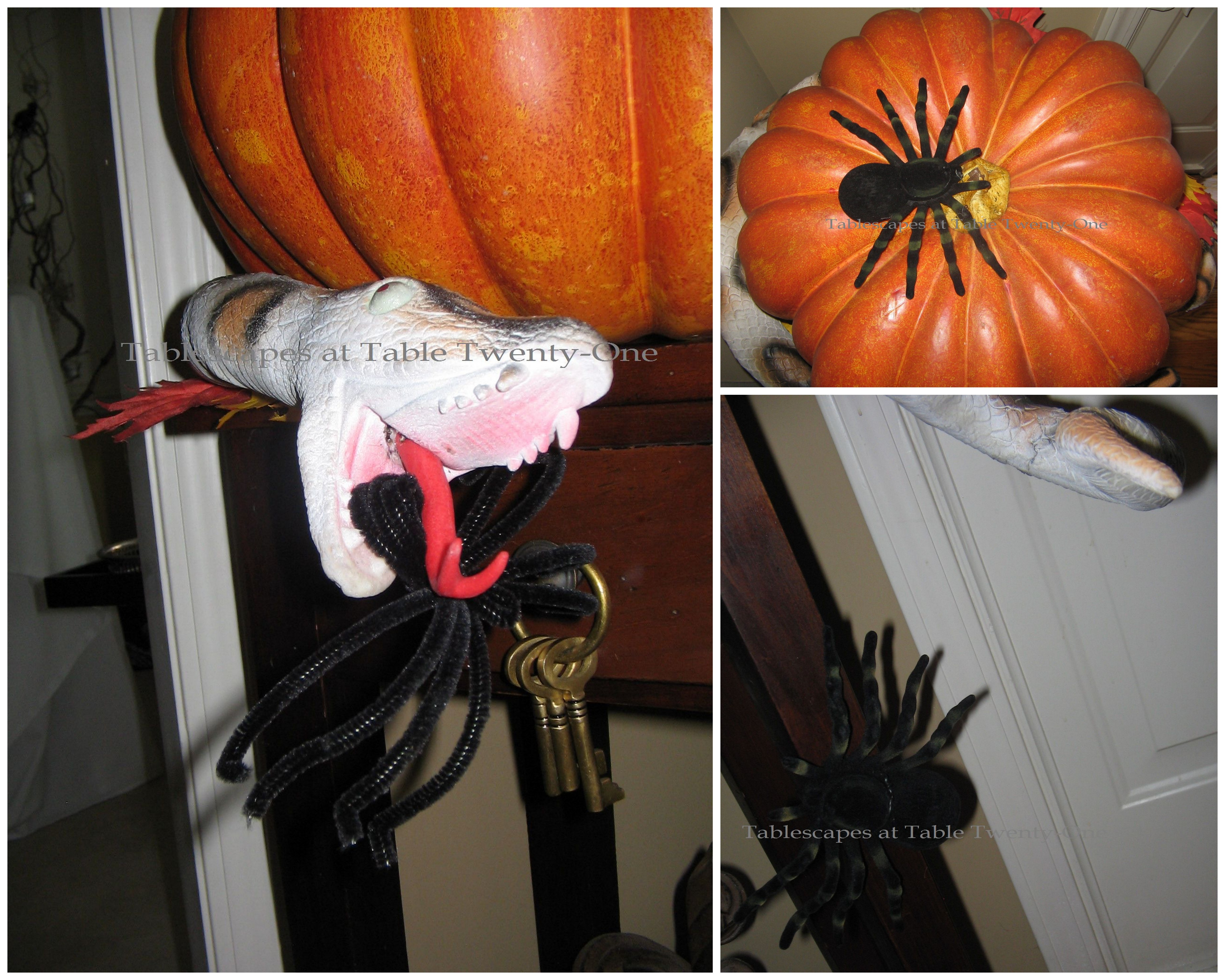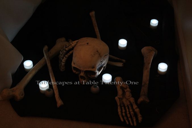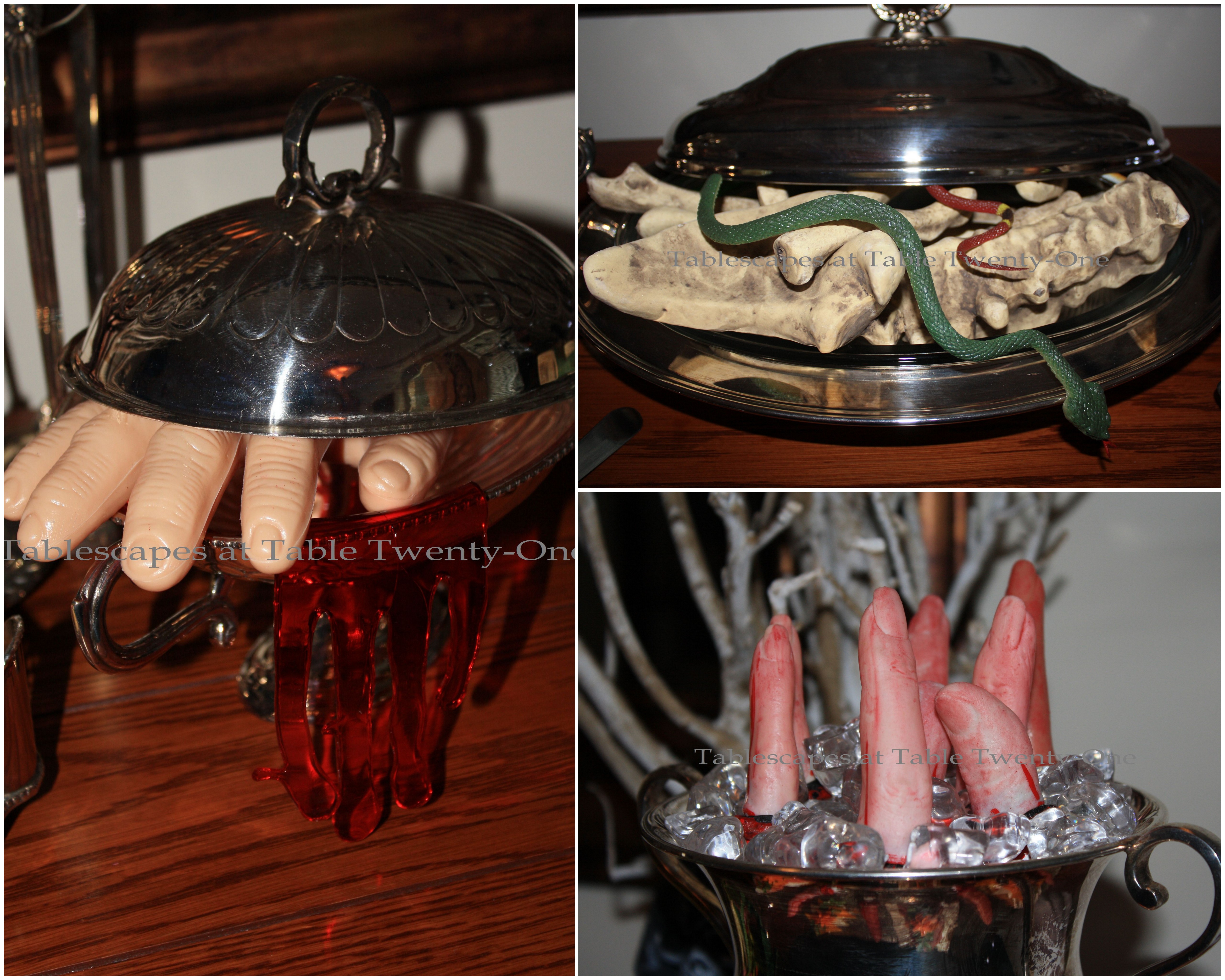 When we say “fresh”, we mean fresh!!! The blood has barely begun to coagulate on another enticing entrée called “Nevermore Hand Hash.” Enjoy the crunchy goodness of bone casserole served with slithering snakes. And for dessert: lovely lady fingers, of course! Once again, take notice of the tarnished silver. (It took incredible restraint to let all of these silver pieces tarnish like this in anticipation of using them for Halloween!!!!!) Tip: The Dollar Tree “blood” is fun to work with, but it WILL STAIN WOOD FINISHES!!!!!!!!!! I found this out the hard way! 😦