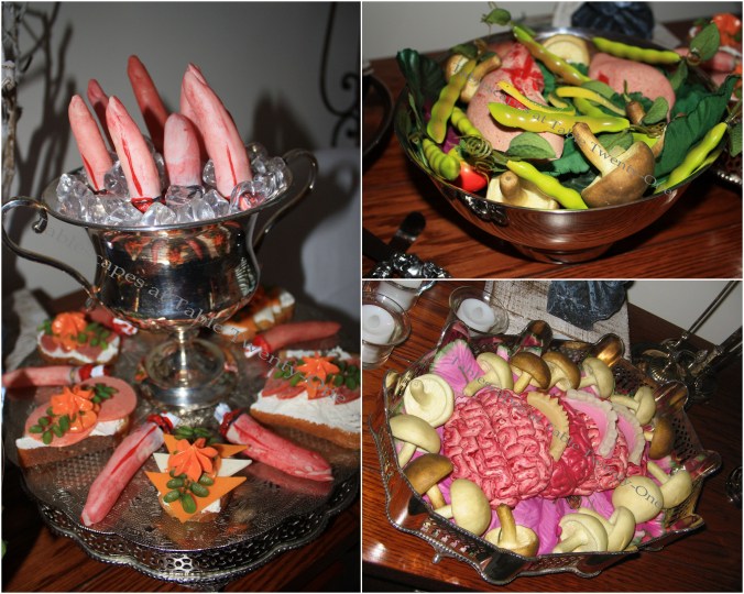 Start your meal with an appetizer of assorted finger foods. Move on down the buffet line to a tasty Silence of the Lambs-inspired liver & fava bean salad. You have your pick of entrées including a ghoulishly gastronomical delight of brains with death cap mushrooms picked from our very own yard. Bwahahahahaha! (Entrails and severed body parts all from Dollar Tree.)