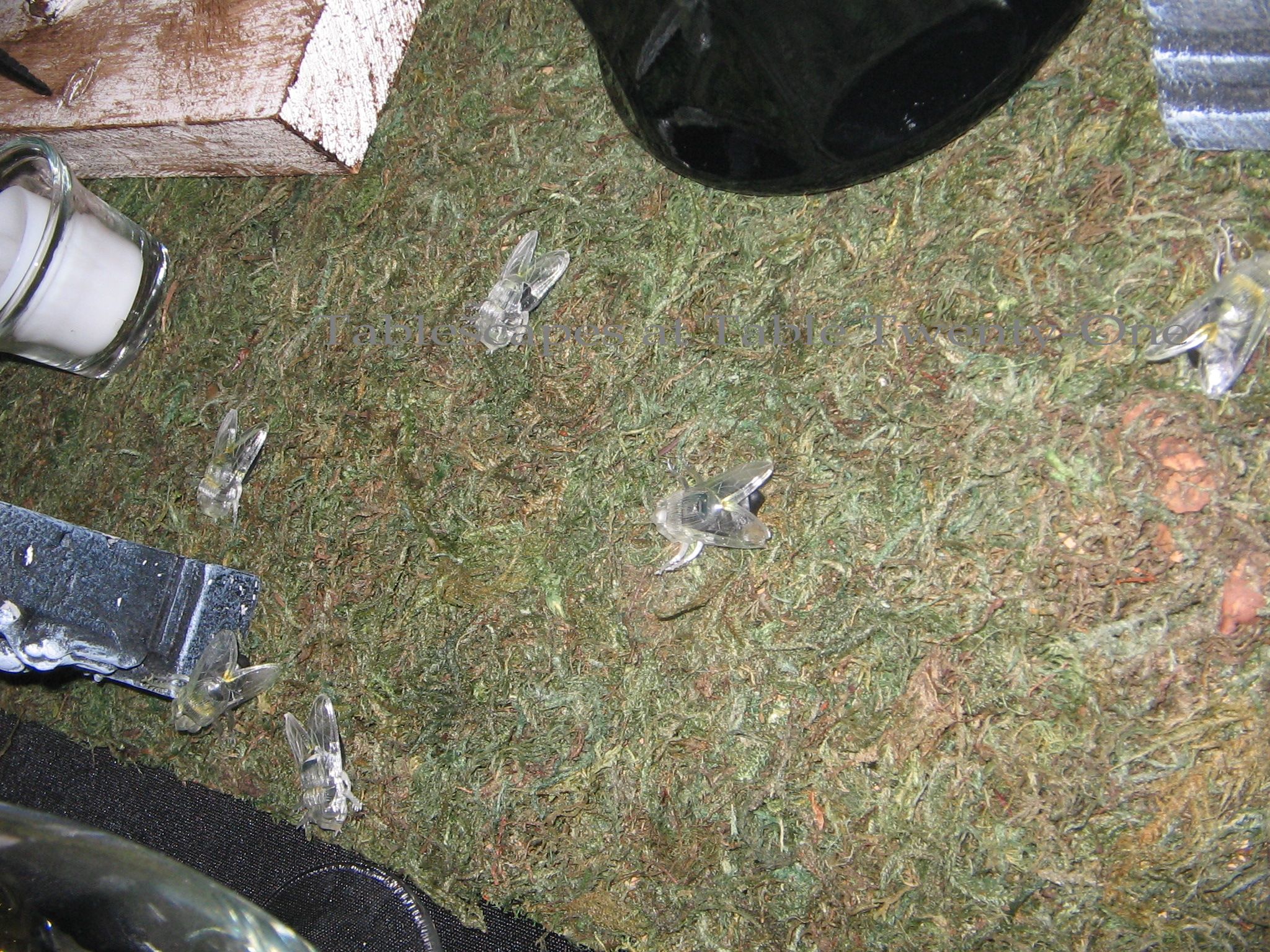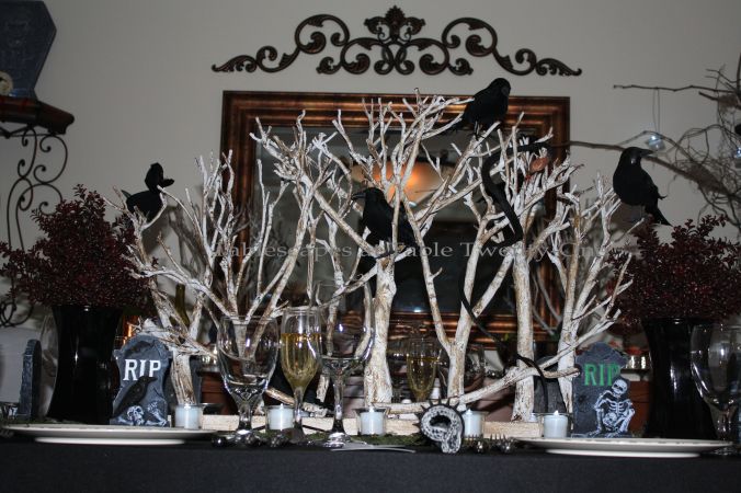 The main part of the centerpiece is this gnarly manzanita branch structure from Gordman’s. It’s big but guests can still see one another. Lurking in the branches are vicious snakes and surly ravens, both from Dollar Tree.