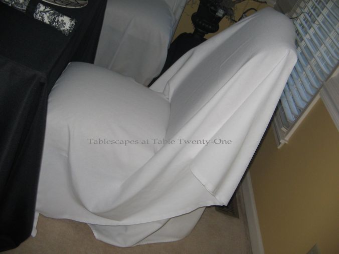 I gave chairs a ghostly look by covering them with oblong table linens. The same effect can be achieved with queen- or king-sized bed sheets.