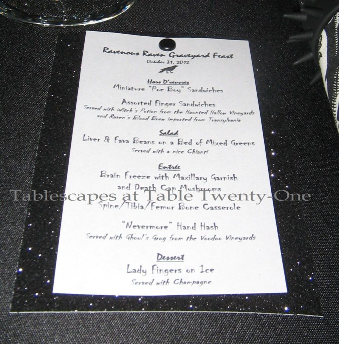 I had fun creating these menus. The backing is sparkly black paper from Michael’s craft store. I secured the printed page onto the backing with a black brad from Hobby Lobby.