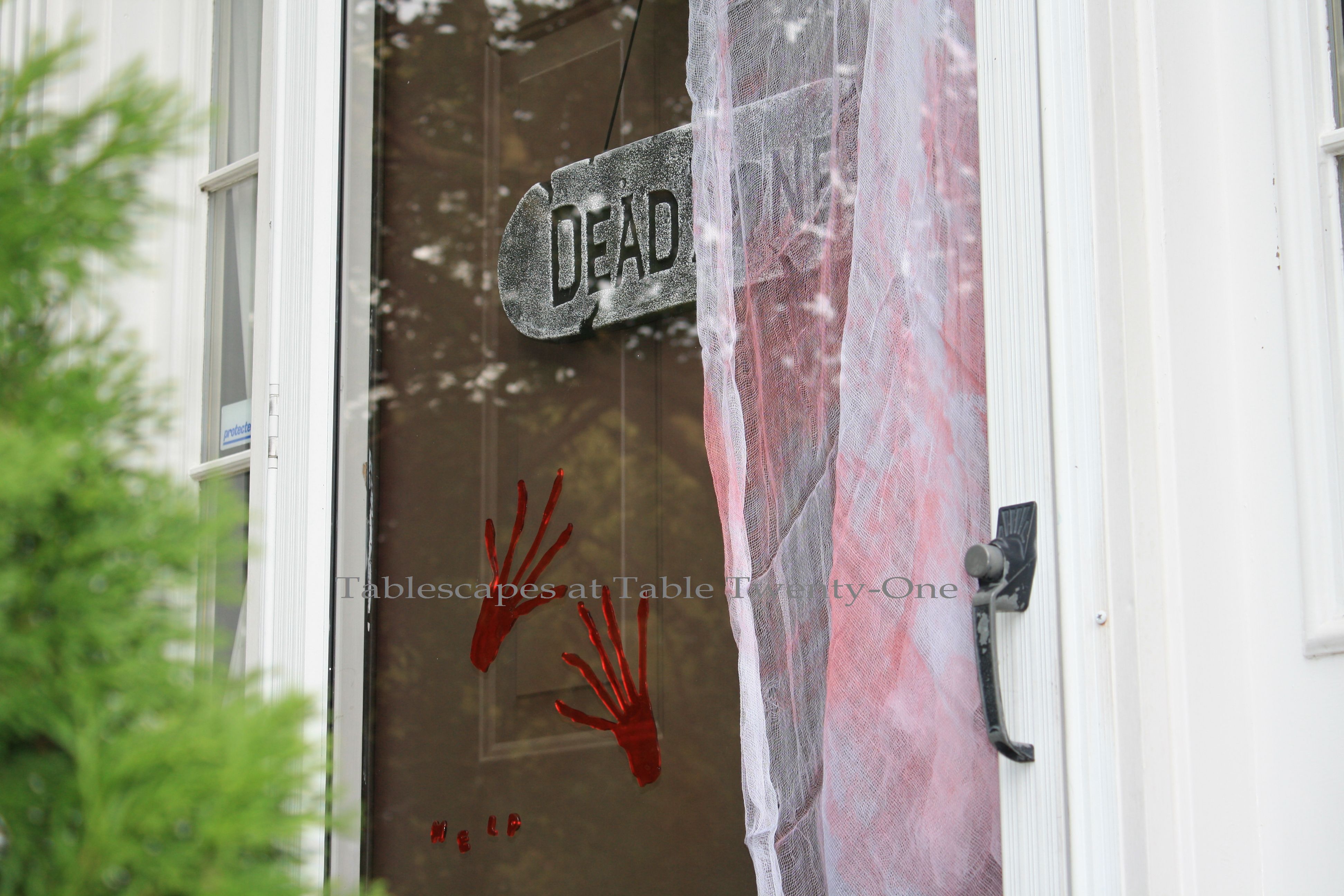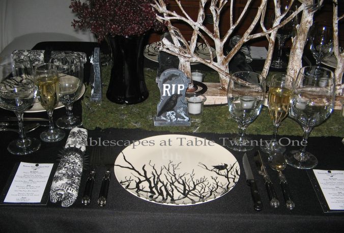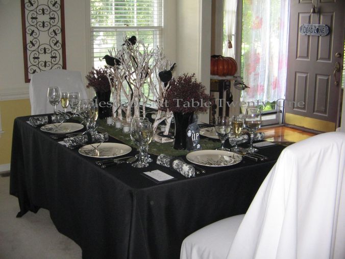 A headstone marks the grave place setting of each guest. You might use gray duct tape upon which to write the names of each victim guest and affix it to the headstone to create a place card. (If you want to really personalize your headstone place cards, click HERE for my good friend and floral guru Kelly Acock’s step-by-step instructions.)