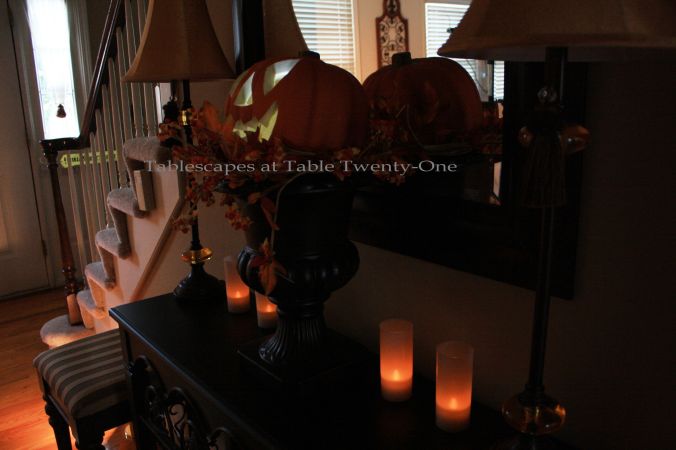 The foyer table just beneath the stairwell is quietly aglow with an uplit pumpkin on a black urn and a few LED candles. I used LED candles throughout for safety’s sake.