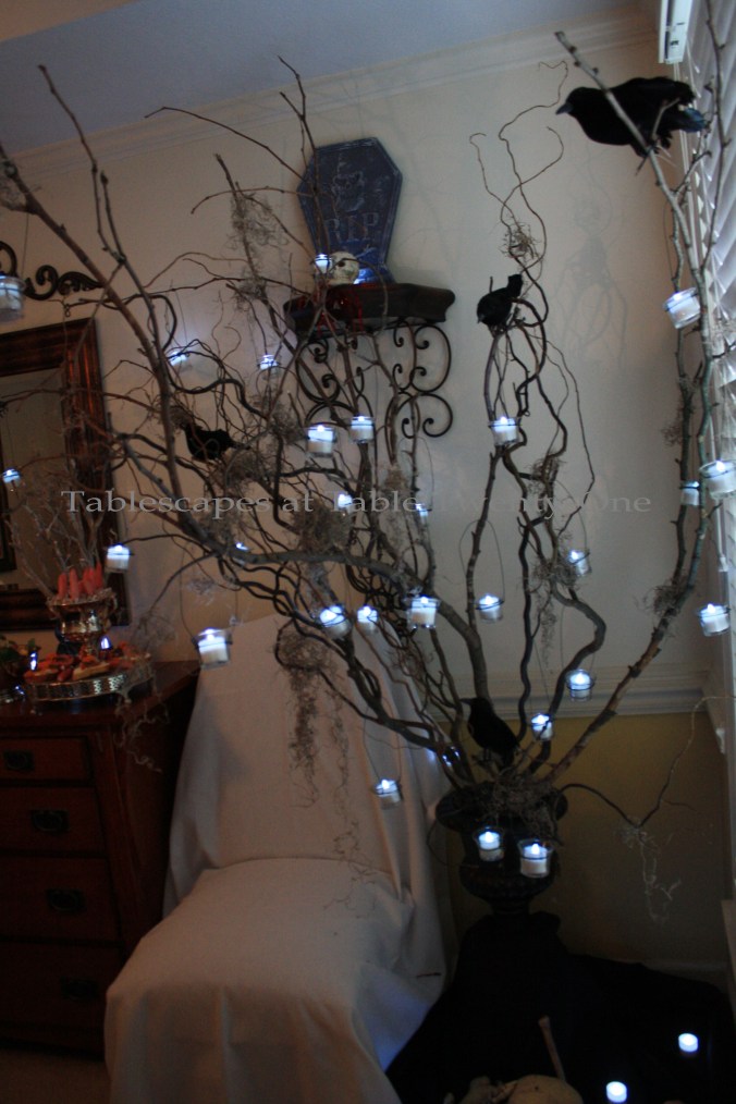 I created this spooky Halloween “tree” using a fallen limb from our yard augmented with several curly willow branches tied in with a virtually undetectable dark-colored wired jute. I secured the branches under dark river stones in a black urn that I sat on a box (disguised by a black linen) to lend a bit more height. The votive hangers were hand-fashioned from a medium gauge floral wire. Once again, LED candles are used to be safe around the dry wood. I finished the arrangement off with mounds of Spanish moss.