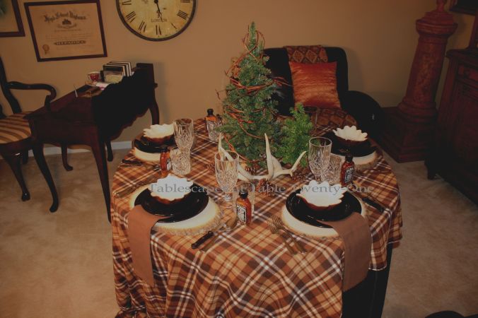 Set up in our little library, this 48-inch round table is dressed in a full-length black linen that is topped with a piece of wonderfully soft and washable black, brown & white plaid fleece from Hobby Lobby. The fleece tablecloth conveys warmth, while the plaid pattern reminds me of the flannel shirts guys often wear under their camouflage jackets.