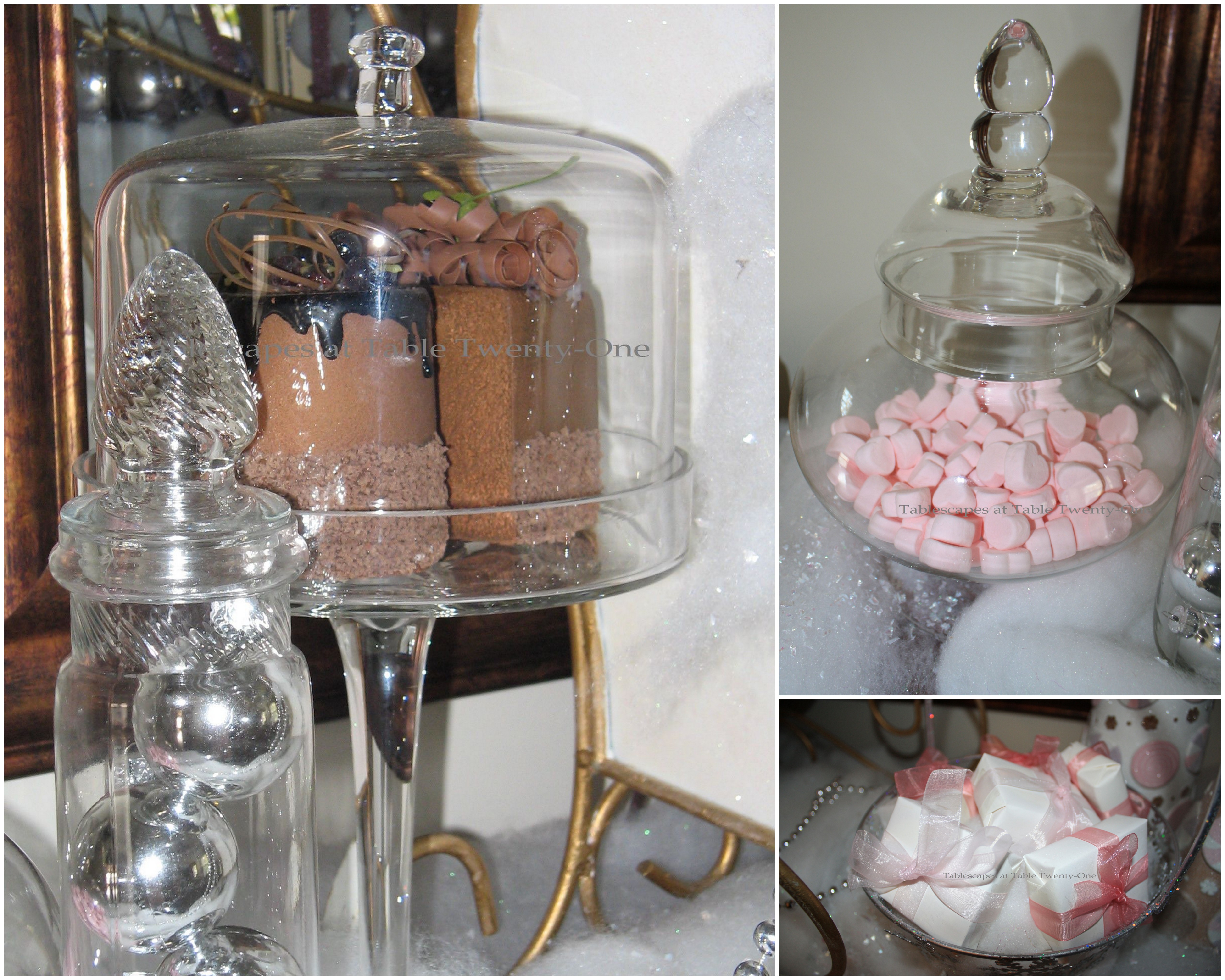 These “sugary” pink, purple, chocolate & white figurines picked up at 75% off at Burlington‘s end-of-season sale last year were the inspiration for the table. The sparkly finish on them makes them shimmer in the light.