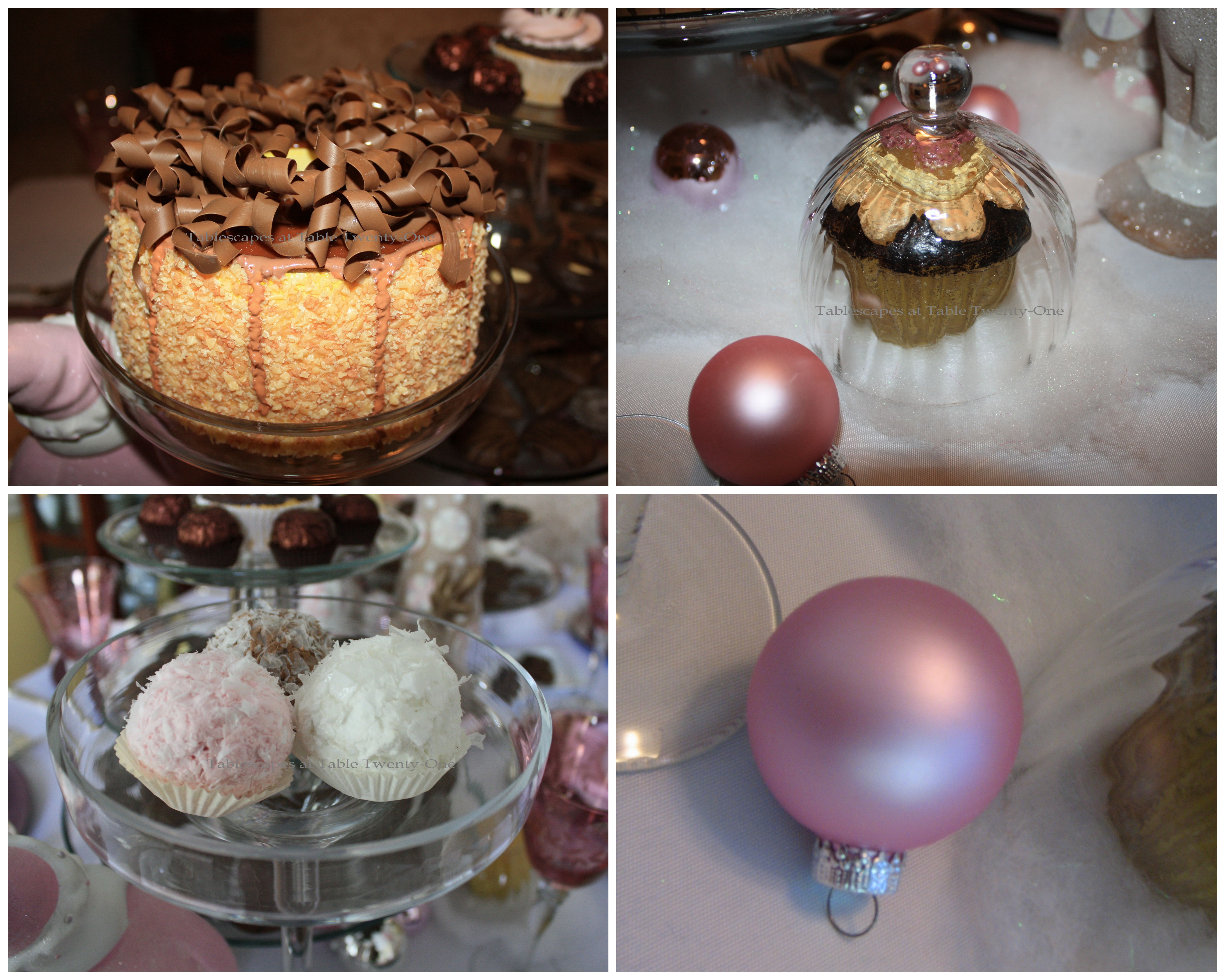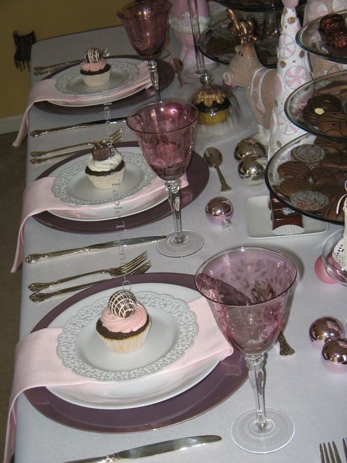 I just love this Alycia! 🙂 I love the little wrapped gifts in the bowl next to the sleigh, I love all the layers of chocolates and other confections, I LOVE those white doily plates from Pier 1, the pale pink napkins, and the pink and purple Christmas ornaments. This is all such a magical creation; your students must really enjoy your tablescaping classes.