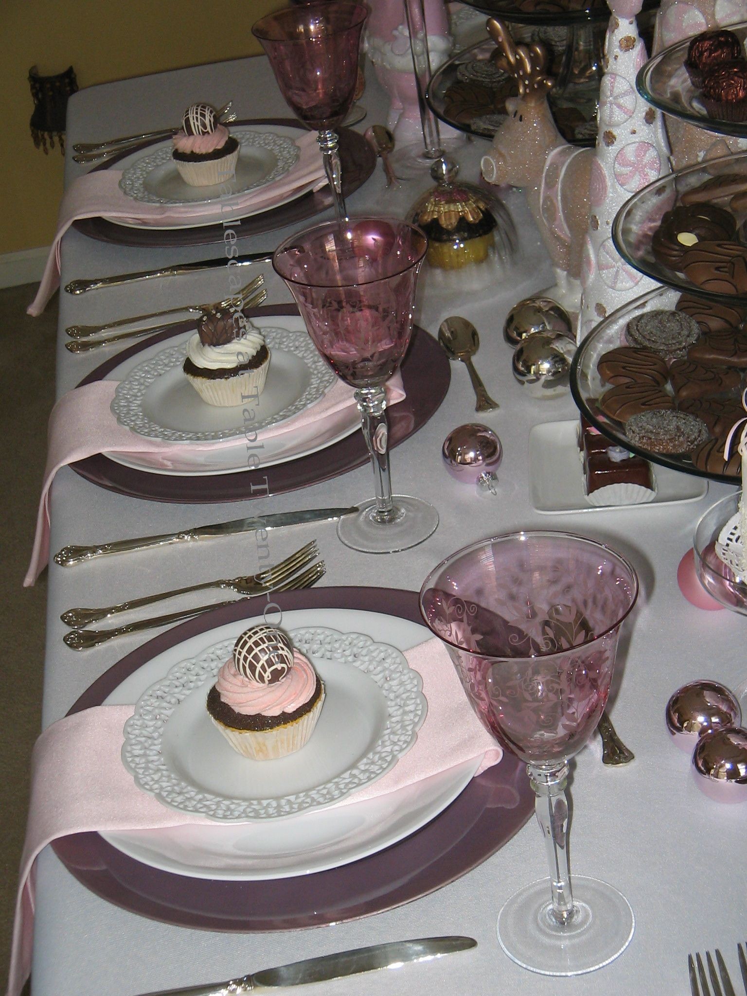 Each place setting begins with a lavender acrylic charger from Michael’s Craft Store. A plain white Corelle dinner plate is separated from the lacy white Pier 1 plate with a shot of pastel pink found in the napkin. The bon-bon topped cupcake is the final ingredient to create this pink, purple and chocolate Christmas setting. The silver flatware is very dressy…one of those “grown up” touches to keep the look from becoming too cutesy for teens and tweeners. No menus used. They’re teens, so you can just text them! 😉