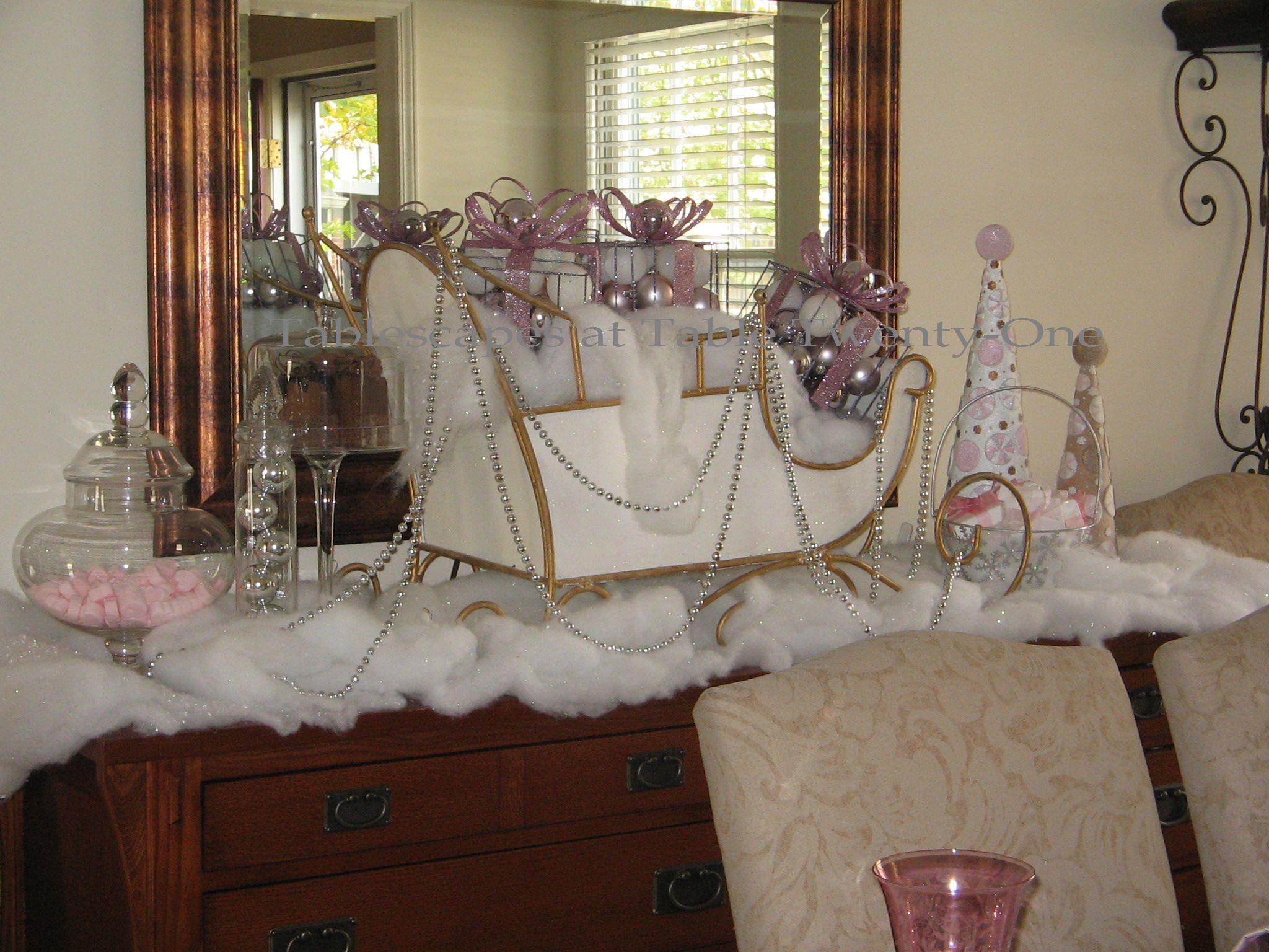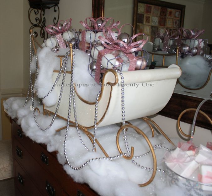 Visions of sugar plums are dancing in my head! Your table and buffet are beautiful! I love the etched stemware and that awesome sleigh!