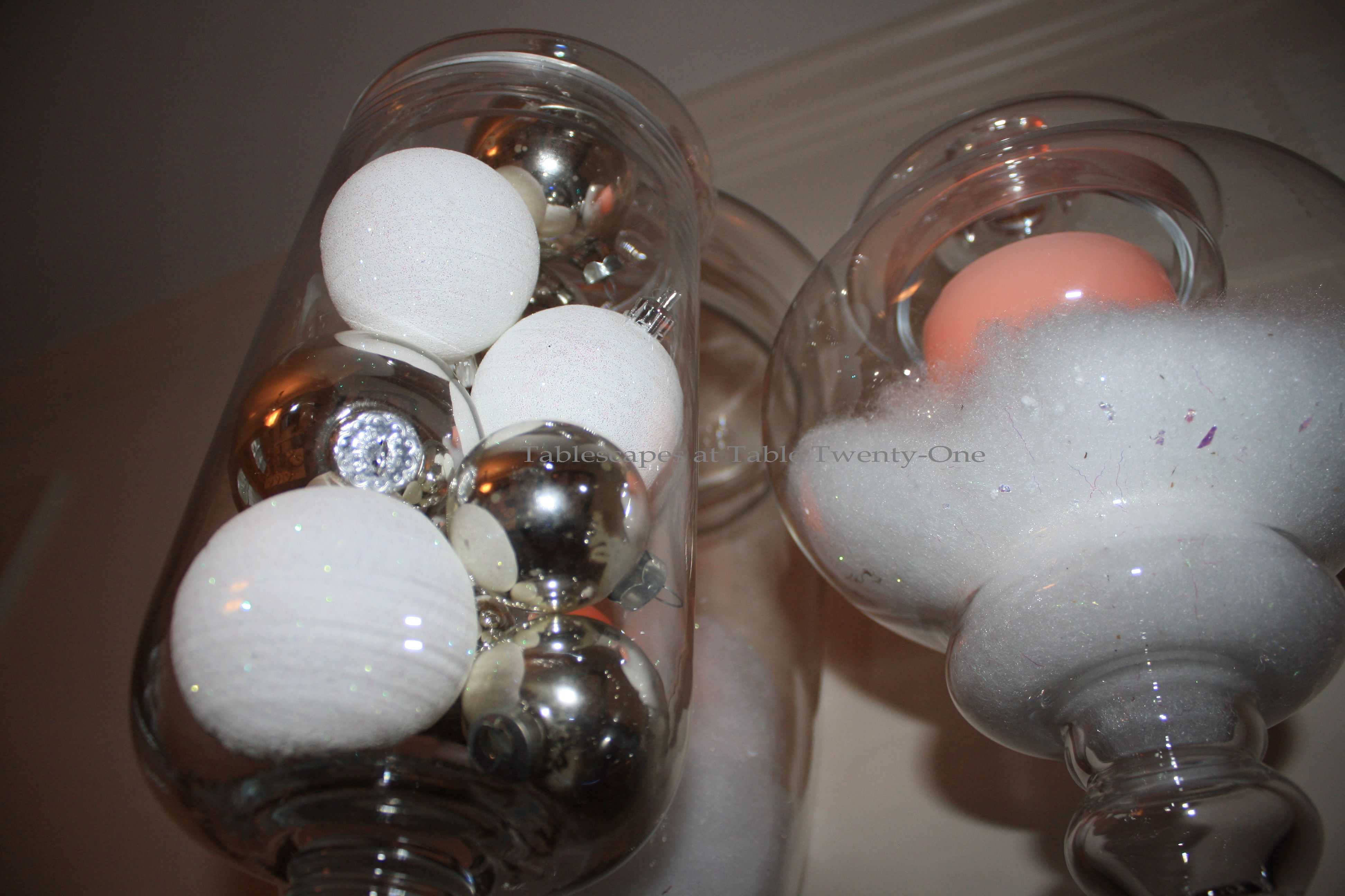 More apothecary jars filled with snow, ornaments, and LED candles sit atop the china cabinet.