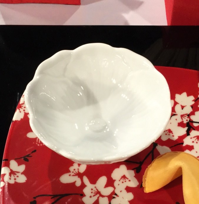 Each place setting has a black acrylic square charger (Walmart) topped with an Asian-themed 222 Fifth square plate (“Mia Blossom”) and small rice bowl from Pier 1 Imports. Pier 1 is a terrific place to buy globally themed dishes and decor! If you don’t have one near you, their website is pretty easy to navigate. (Too tall for this television demo, but a vase or two with a simple arrangement of cherry blossoms would be perfect for this tablescape!!)
