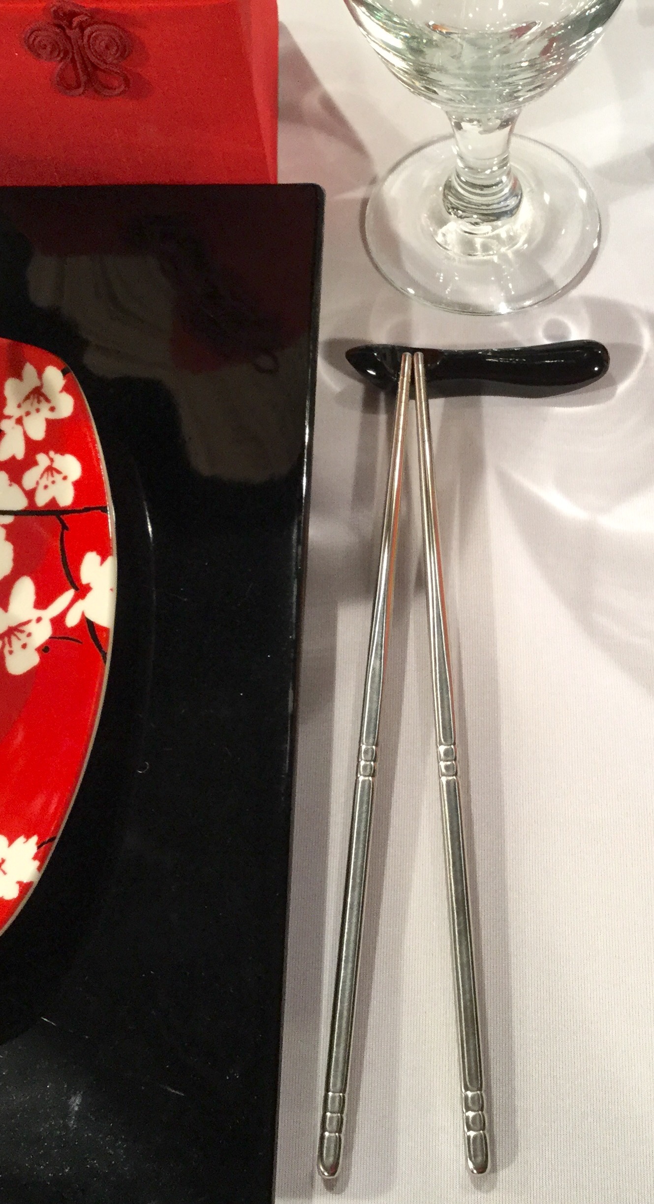 Not everyone is adept at using chopsticks, so as a courtesy to your guests you may want to add flatware such as this faux bamboo stainless. Use the wooden chopsticks typically provided by the restaurant, or consider investing in a pair of permanent ones like these stainless steel beauties resting on a black onyx holder from a local specialty store. The white miso spoons here are from Pier 1. The “Capri” porcelain spice cellars by Gallery Tabletops are from T.J. Maxx and are great for spices or sauces at individual place settings.
