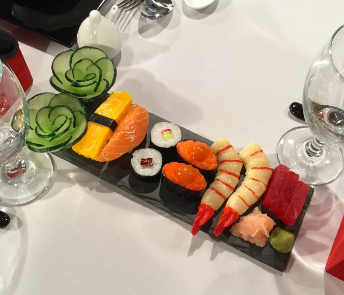 As I pointed out on the show, sometimes food is just so beautiful you might consider using it as a centerpiece. While this sushi is just a pretty good fake for demonstration purposes, it represents the real thing which always abounds in color, form, and texture…perfect elements for a gorgeous centerpiece!