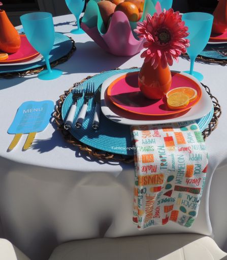Each place setting starts with a fabulous natural round “Water Hyacinth” placemat from Pier 1. These are so incredibly versatile! I’ve used them in various tablescapes including “Barton’s Easter Brunch“. Next up are woven round placemats in a glorious “Peacock Blue” from Bed Bath & Beyond also seen on “Summer Fruits & Penny-farthings” and “Give Peace A Chance” on this site. White melamine dinner plates from Target are topped with dazzling orange-rimmed pink melamines from Burlington that I first introduced in the post “Oranges & Blossoms” back in September of 2010 and then reintroduced in “Hot Tropical“!