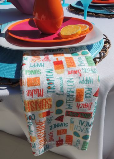 The inspiration for this tablescape came not only from the heat and my affinity for adult popsicles, but from these super cute Dollar Tree dish towels! I like to use them as napkins for their super powers of absorbency as well as the colorful themes! I’ve used dish towels as napkins for several warm weather posts including “Grill It Up!“, “Most Egg-cellent Fall Breakfast“, “Italian Honeysuckle“, “Picnic Ants“, and “Black & White Barnyard Breakfast“.