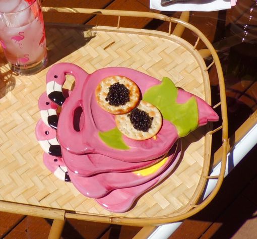 Sips and snacks are set up on a bamboo tray in the seating area. A sweet blog friend gave me these ceramic flamingo appetizer plates a few years ago, and I love them as much today as when I first got them. Thank you, Mona!