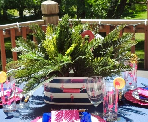 The inspiration for this tablescape came from this fun navy & white striped bucket peppered with flamingos from Home Goods. (I think its original intent is to be used as a flatware caddy, but what the heck…I march to the beat of my own twisted drum sometimes!) I filled it with sago palms and tucked in a metal flamingo for a quick, easy tablescape with tropical flair.