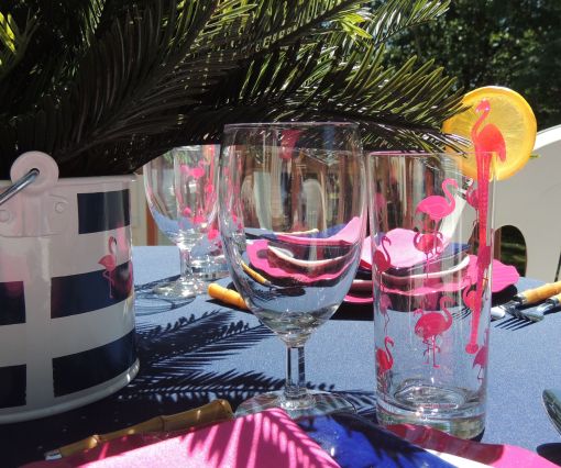 My objective was to set off the bright pink and white against the deep blue. The Crate & Barrel charger for each setting has a bright pink ruffled edge. Plain white dinner plates are offset by navy blue square salad plates from Pier 1. The cotton napkins are from Bed Bath & Beyond, and the faux bamboo flatware is from JC Penney.