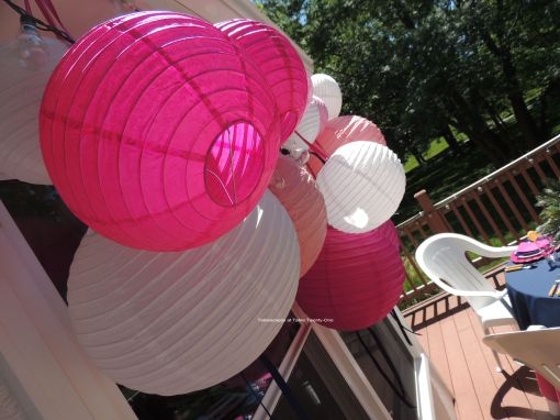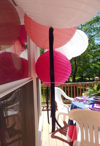 You know how I love my paper lanterns, and for this setting I really loaded ’em up! Varying shades of pink mixed with white lanterns are embellished with navy blue ribbon streamers for additional color and movement.
