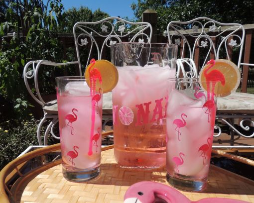 Pink lemonade is the perfect summer drink in these glasses. The plastic pitcher is from Target and the fun flamingo stir sticks from Tuesday Morning.