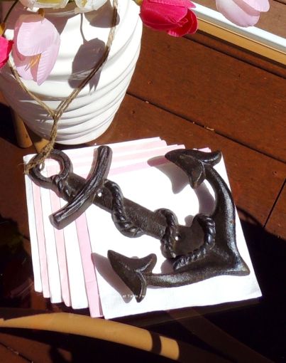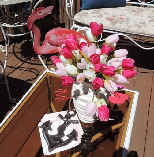 On the other end of the coffee table are a white ceramic vase overflowing with pink and white tulips and a stack of alternating pink & white cocktail napkins literally anchored to keep them from blowing away in the summer breeze.